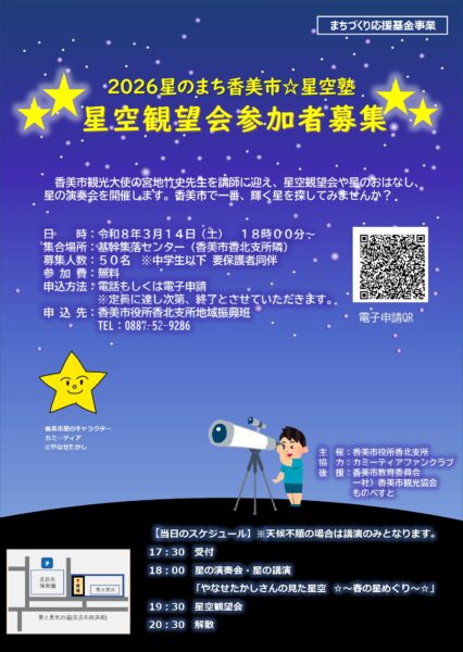 Campaign開催中 2025年12月1日(月)~2026年2月28日(土) 303(三宝山)スタンプラリー 香南市キャンペーンものづくり周遊学習体験展示歴史・文化特典あり食体験お子様向け友達と楽しめる大人向け家族で楽しめる Campaign開催中 1月5日(月)~2月28日(土) 食文化を知ろう! 日本全国スマホでスタンプラリー 香南市香美市キャンペーンお得周遊友達と楽しめる大人向け家族で楽しめる Event開催中 2月1日(日)~3月1日(日) 日本野鳥の会高知支部共催 「野鳥の写真展 in のいち動物公園」 香南市イベント展示友達と楽しめる家族で楽しめる Event開催予定 2026年3月7日(土) さわる動物園 香南市イベント学習体験友達と楽しめる家族で楽しめる Event開催中 2月7日(土)~3月8日(日) 第3回ゆるり赤岡体験博2026 香南市イベントグルメものづくり学習体験歴史・文化自然体験お子様向けママ向け友達と楽しめる大人向け家族で楽しめる Event開催予定 3月14日(土)~3月14日(土) 星空観望会参加者募集 香美市イベント学習体験自然体験講演会お子様向け友達と楽しめる大人向け家族で楽しめる イベント一覧を見る