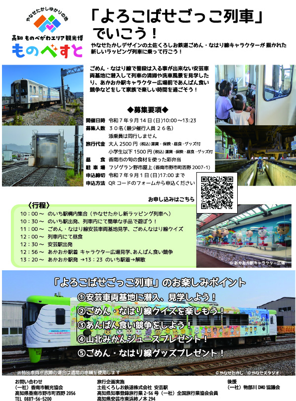 ごめん・なはり線で普通は入ることが出来ない安芸車両基地に潜入して、列車の清掃や洗車風景を見学したり、あかおか駅キャラクター広場前であんぱん食い競争などをして家族で楽しい時間を過ごそう。
