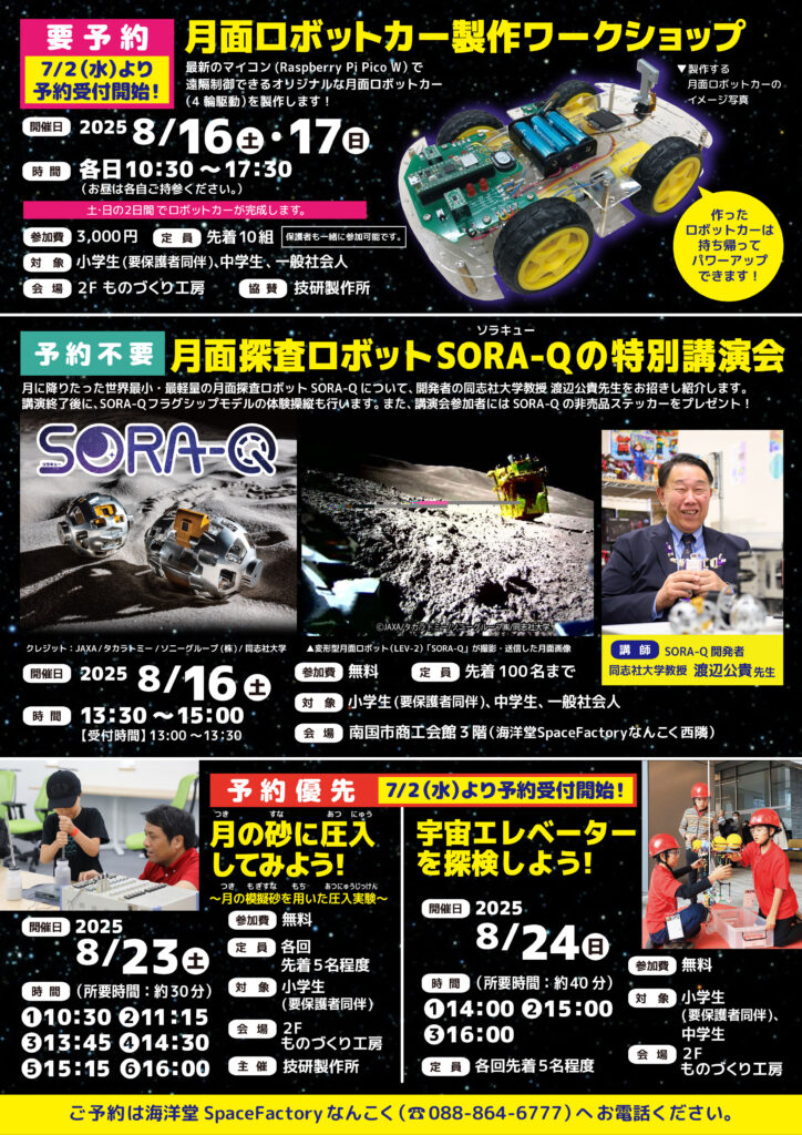 月に降り立った世界最小・最軽量の月面探査ロボットSORA-Qについて、開発者の同志社大学教授 渡辺公貴先生をお招きし紹介します。講演終了後にSORA-Qの体験操縦も行います。また参加者にはSORA-Qの非売品ステッカーをプレゼント