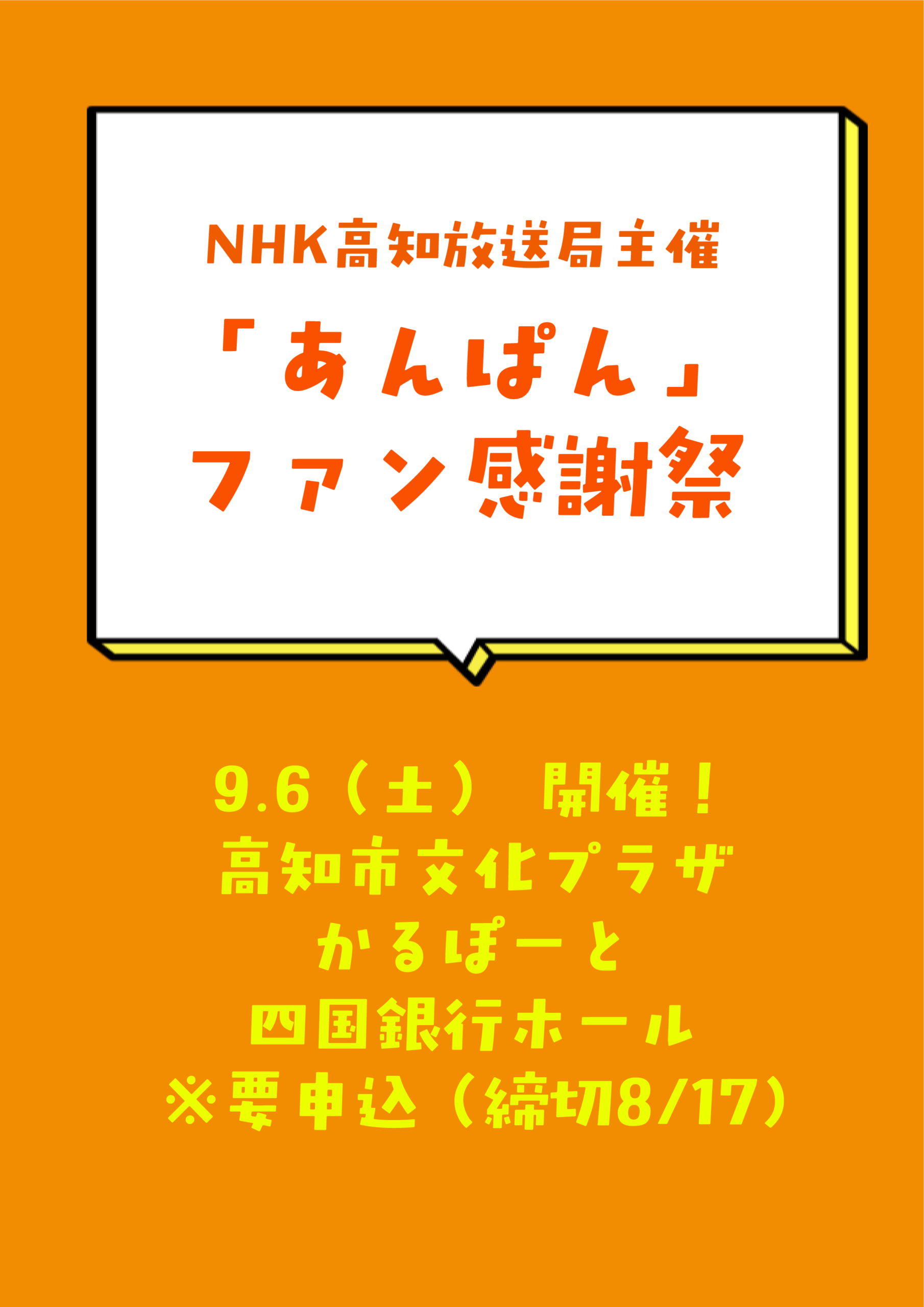 ホーム > EVENTS > 【終了しました】NHK高知放送局主催「あんぱん」ファン感謝祭9/6(土)開催!