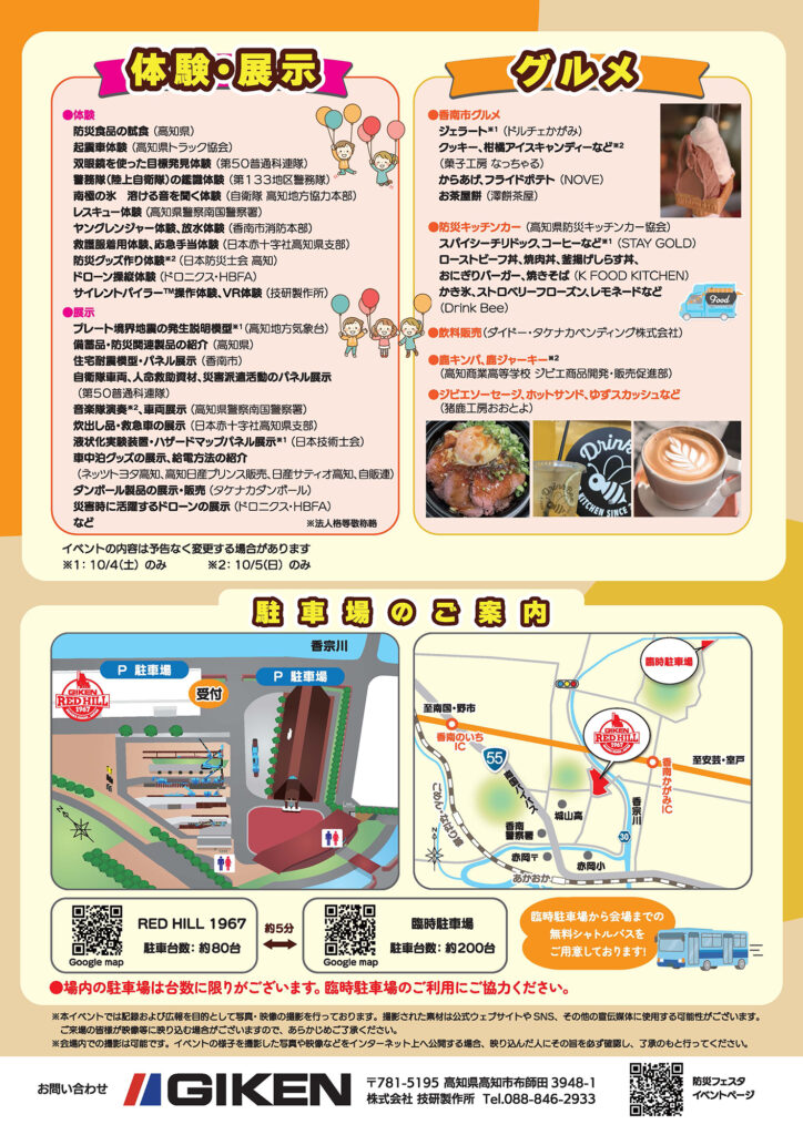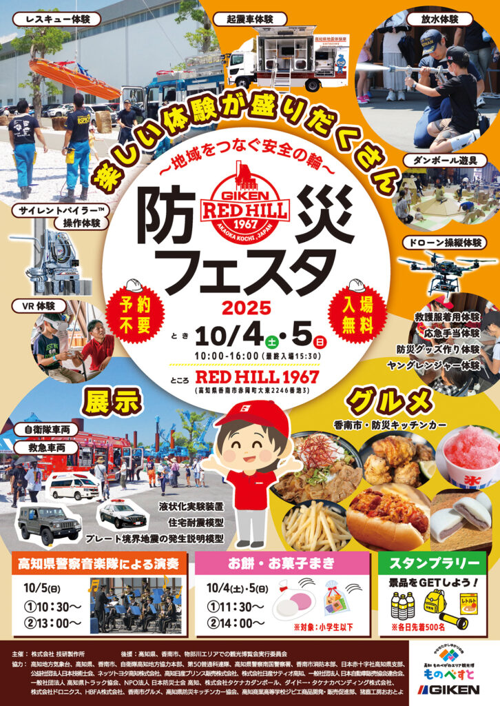 香南市グルメや高知県警察音楽隊による演奏、お子様向けのお餅やお菓子まき、スタンプラリーなど楽しい体験や展示が盛りだくさん!お気軽にお越しください!