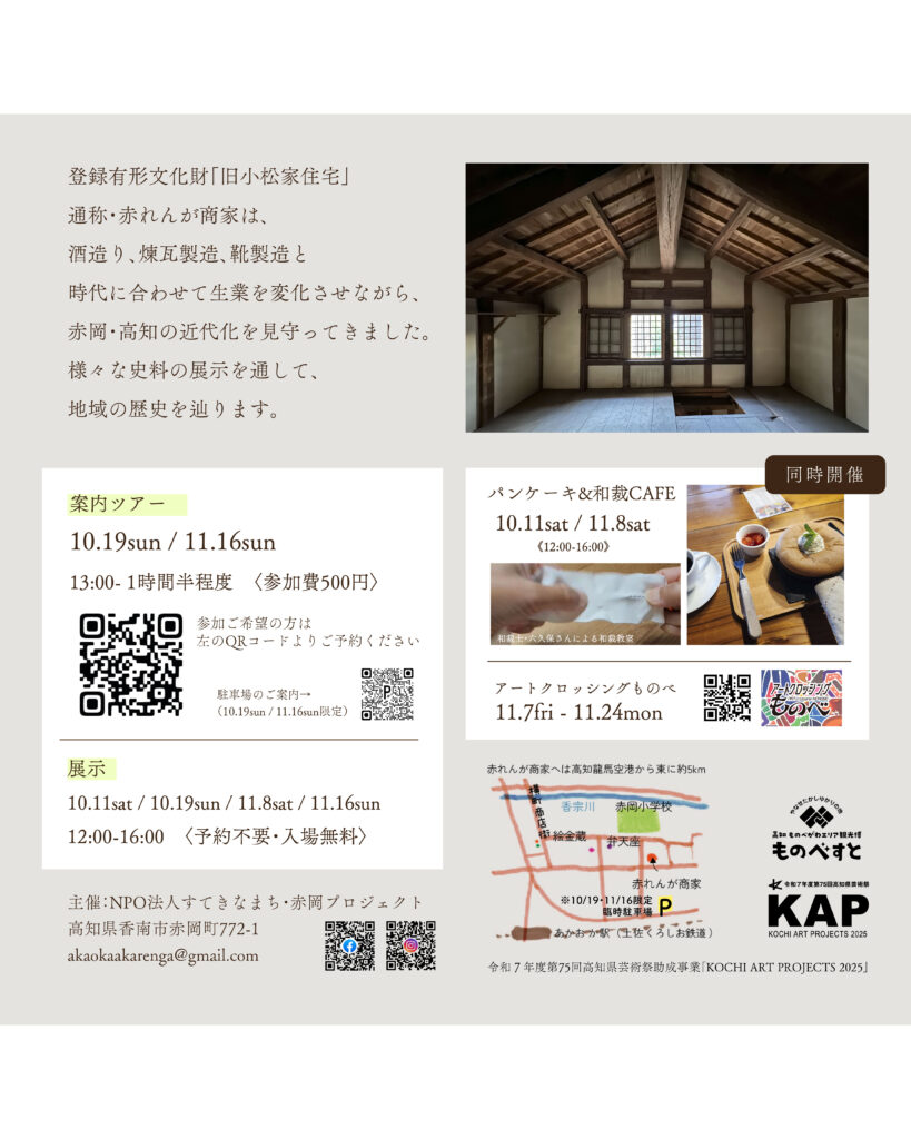 登録有形文化財「旧小松家住宅」通称・赤れんが商家は、酒造り、靴製造、煉瓦製造と時代に合わせて生業を変化させながら、赤岡・高知の近代化を見守ってきました。様々な史料の展示を通して、地域の歴史を辿ります。期間中には建築ツアーも開催します。
