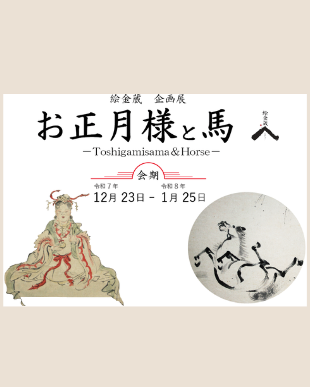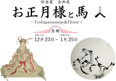 本展では絵金の長男・房太郎が養子となった家に伝わる艶やかな掛軸「お正月様図」の展示や、令和8年の干支である「馬」の白描画を紹介いたします。
