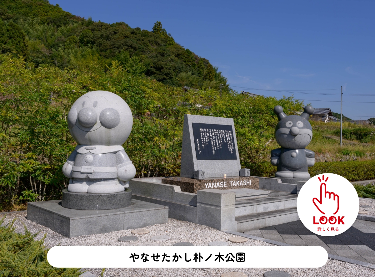 やなせさん・暢さん夫妻が眠る墓地公園。敷地内には「アンパンマンのマーチ」や「ホオノキ」の詩碑のほか、アンパンマンとなかまたちの姿も。地名の「朴ノ木」は、木質がやわらかく周囲を傷つけないことから、やなせさんが好んだ植物の名前でもある。