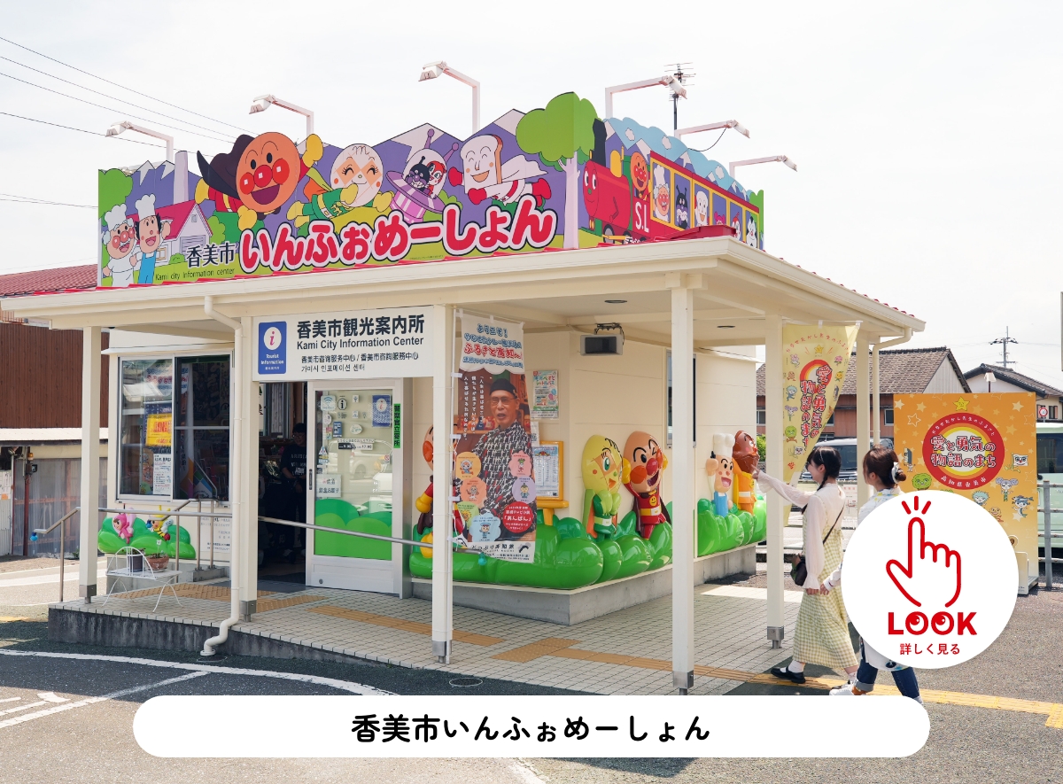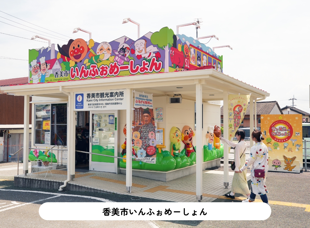 JR土佐山田駅前にある香美市の観光案内所。館内には香美市の観光情報はもちろん、高知県内の楽しい情報が盛りだくさん。やなせさん直筆のサインや、ご本人から寄贈されたアンパンマンの珍しいからくり時計もある。2025年春にフォトスポット新設。