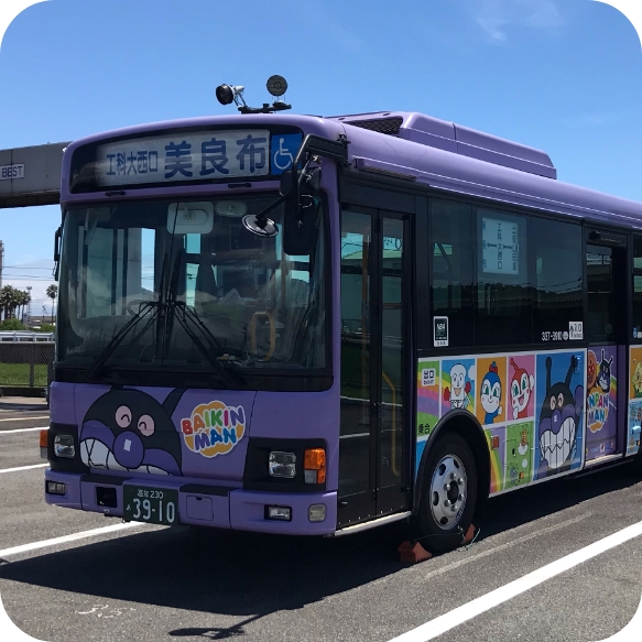 やなせさんのふるさとに行こう!土佐山田駅とアンパンマンミュージアムは、路線バスで結ばれている。アンパンマンバスは、外見はもちろん、車内もアンパンマンとそのなかまたちのデザインがいっぱい! -