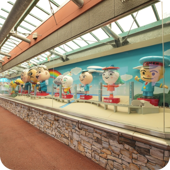 やなせさんのキャラクターが勢ぞろい!絵師・金蔵(通称:絵金)をモデルにした「あかおかえきんさん」はじめ、やなせさんが描いたごめん・なはり線各駅のキャラクターが勢ぞろい。やなせさんのキャラクター以外に町のマスコットキャラクター、「大漁くん」「どろめちゃん」も。