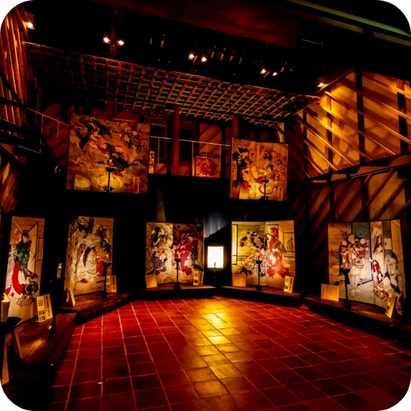 幕末の絵師“絵金”の魅力を伝えるミュージアム赤岡町の須留田八幡宮神祭を模した展示室“闇と絵金”では絵金の芝居絵屛風(レプリカ)を鑑賞できる。提灯を持ち見物することで絵金特有の極彩色や筆の勢いなど、圧倒的な絵の世界に浸ることができる。 -