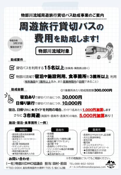 【旅行会社向け】R8年度物部川エリアへの助成金(周遊旅行貸切バス)について