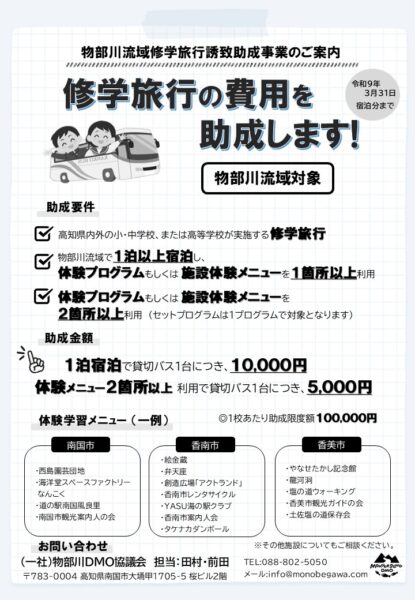 【旅行会社向け】物部川エリアへの助成金(修学旅行)について
