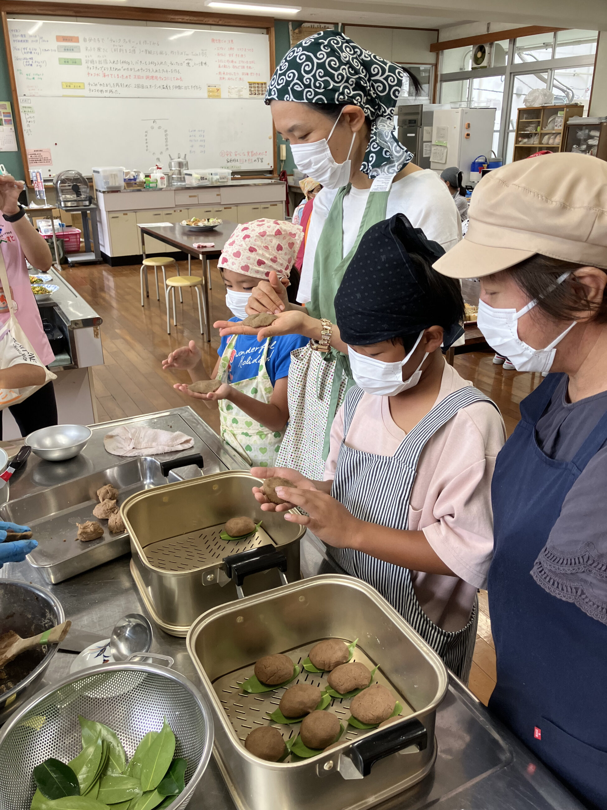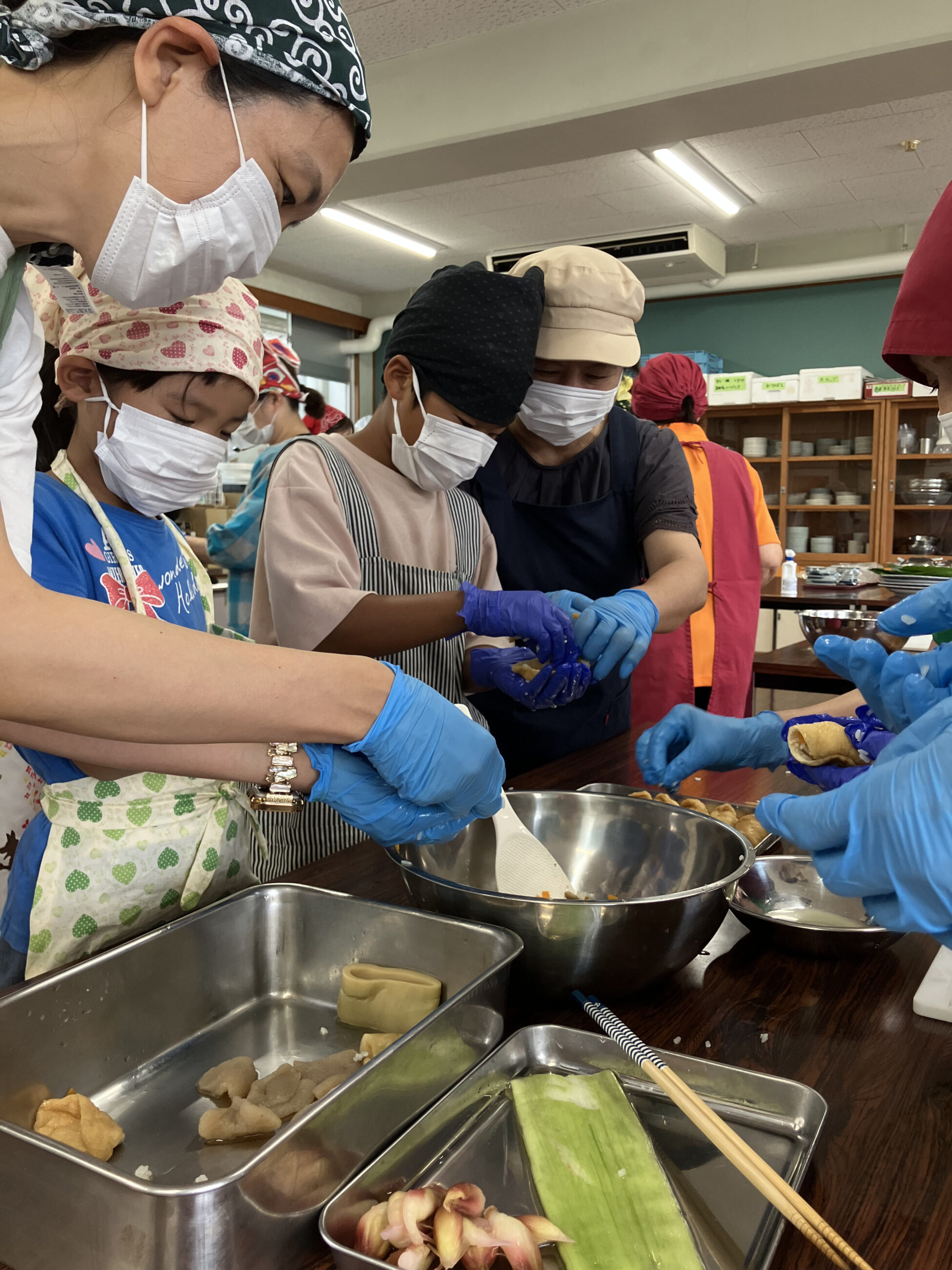 そして、お寿司だけでなく、皿鉢の彩にそえるハランの切り方を習ったり、きりこ餅(お芋の粉で作るおやつ)も体験させてもらいました。子ども達だけでなく、お母さん方も楽しく挑戦して下さいました。
