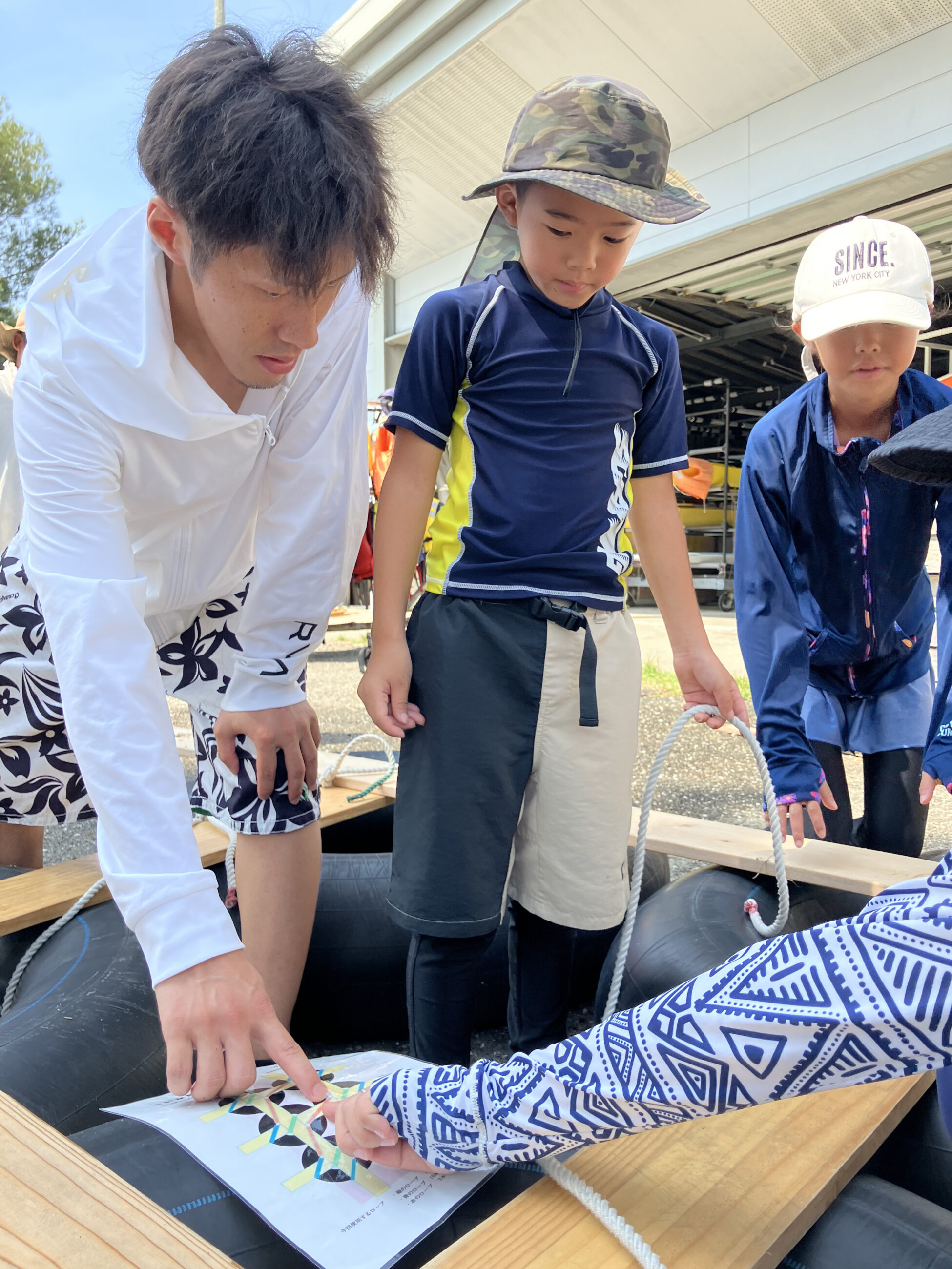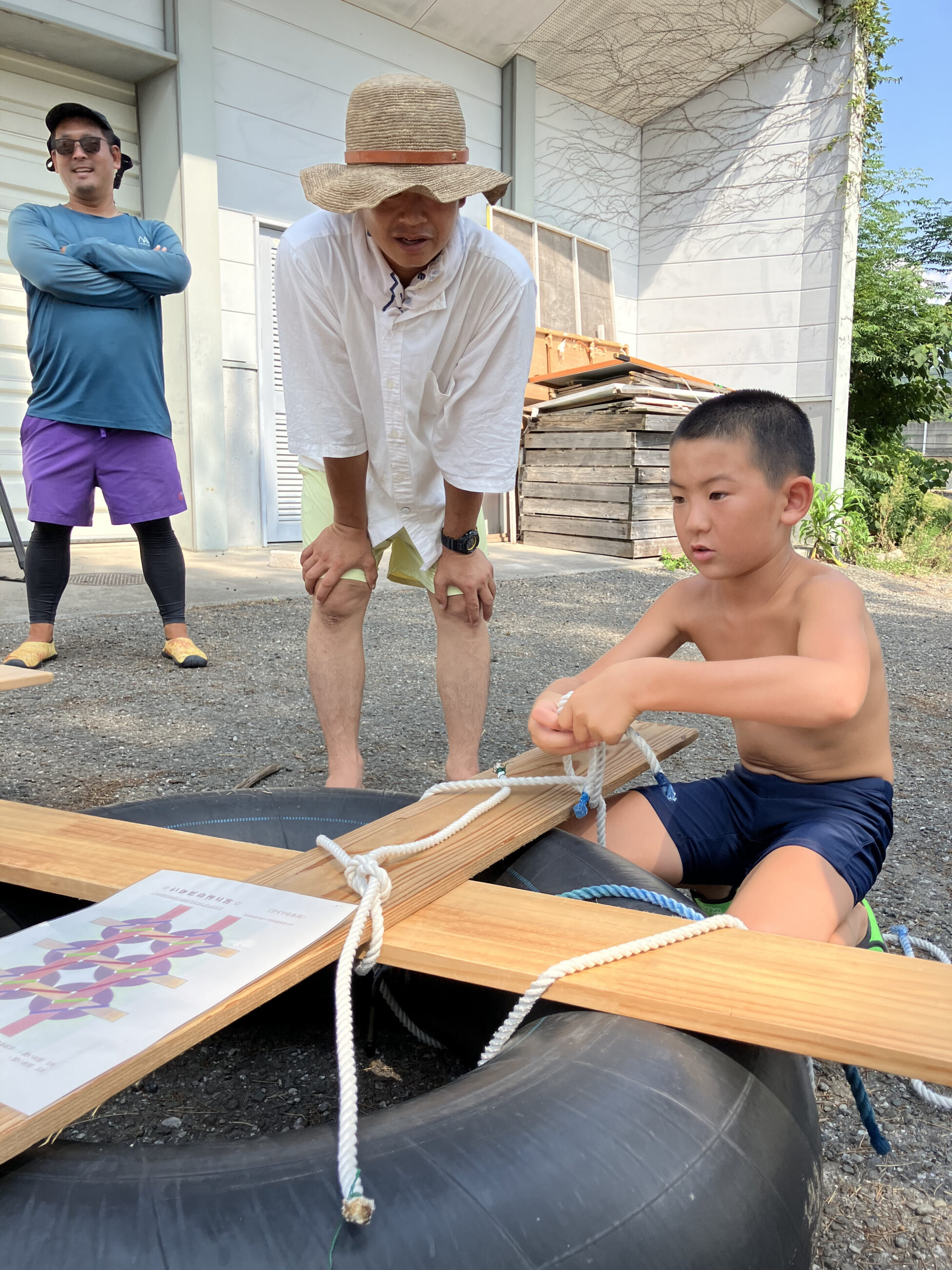 板と板、そしてタイヤチューブを固定するロープの結び方には、ちょっとしたコツがあって、これをマスターするだけで子どもでもしっかりとしたいかだを組む事ができるんです。